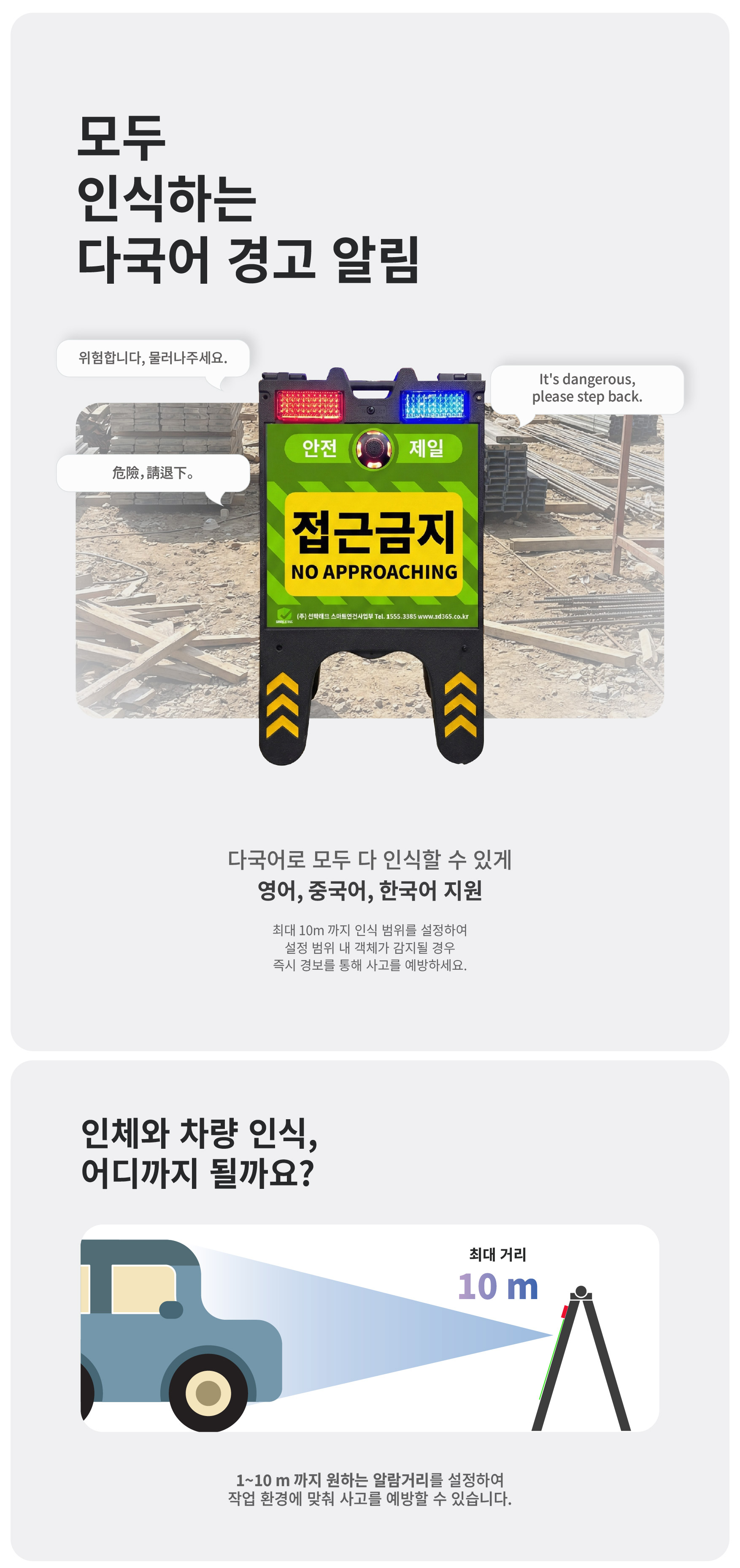 인체 감지 시 보행자에게 즉시 다국어 음성 알람을 전달하고, 원거리에서도 인식 가능한 LED 경광등이 점멸하여 야간 환경에서도 효과적으로 작동합니다.