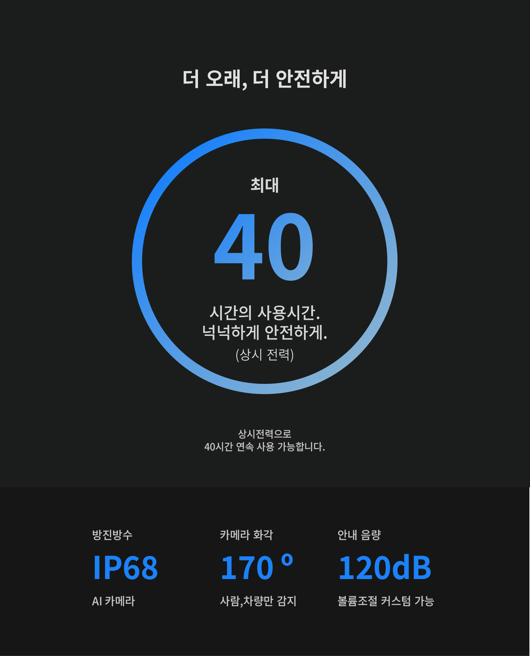 배터리 교체 타입으로 40시간 이상 연속 사용이 가능하며, 상시전력 없이도 안정적으로 작동합니다.