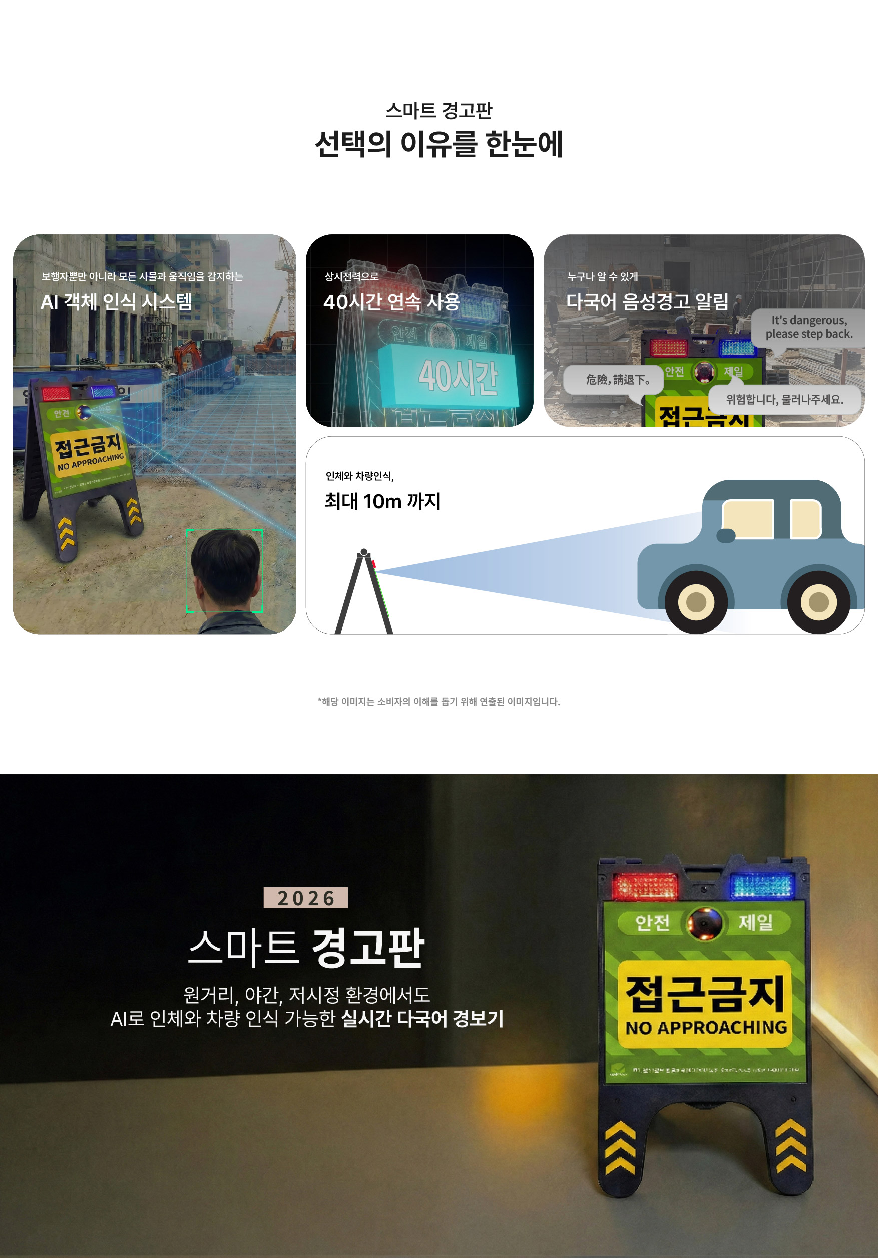 건설 현장, 중장비 작업 구역, 공사 구간 등 위험이 발생할 수 있는 모든 현장에 즉시 적용 가능합니다.